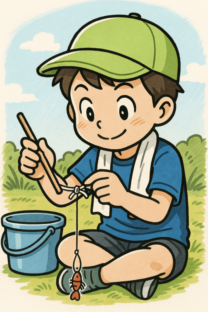 👉 図解(イラスト1枚目予定):子供が割りばしに糸とエサを結びつけて仕掛けを作っているシーン