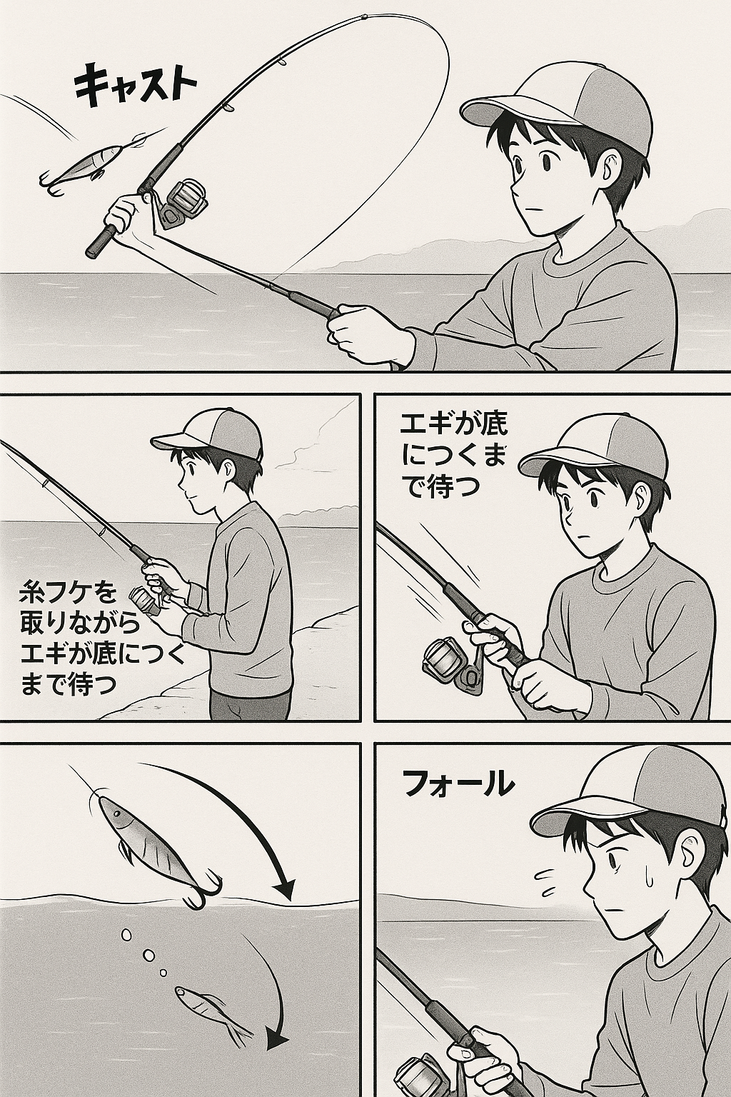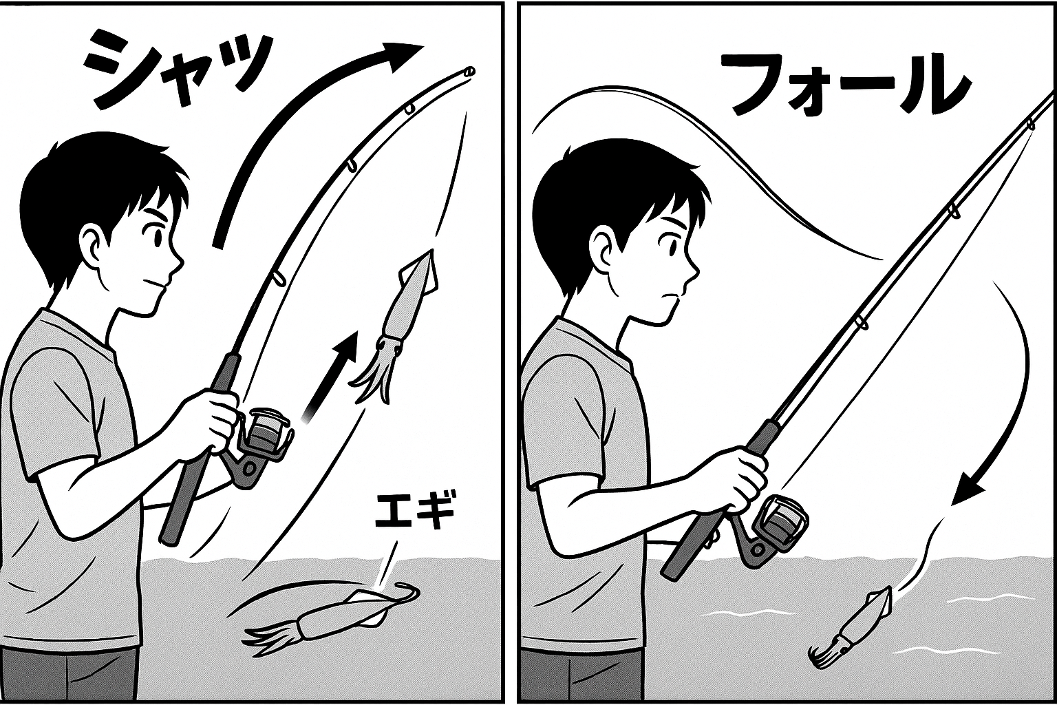 「エギを投げて、しゃくって、落とす」